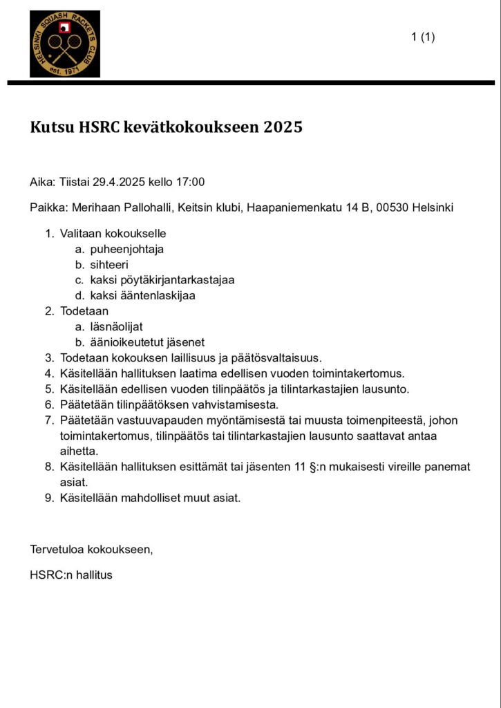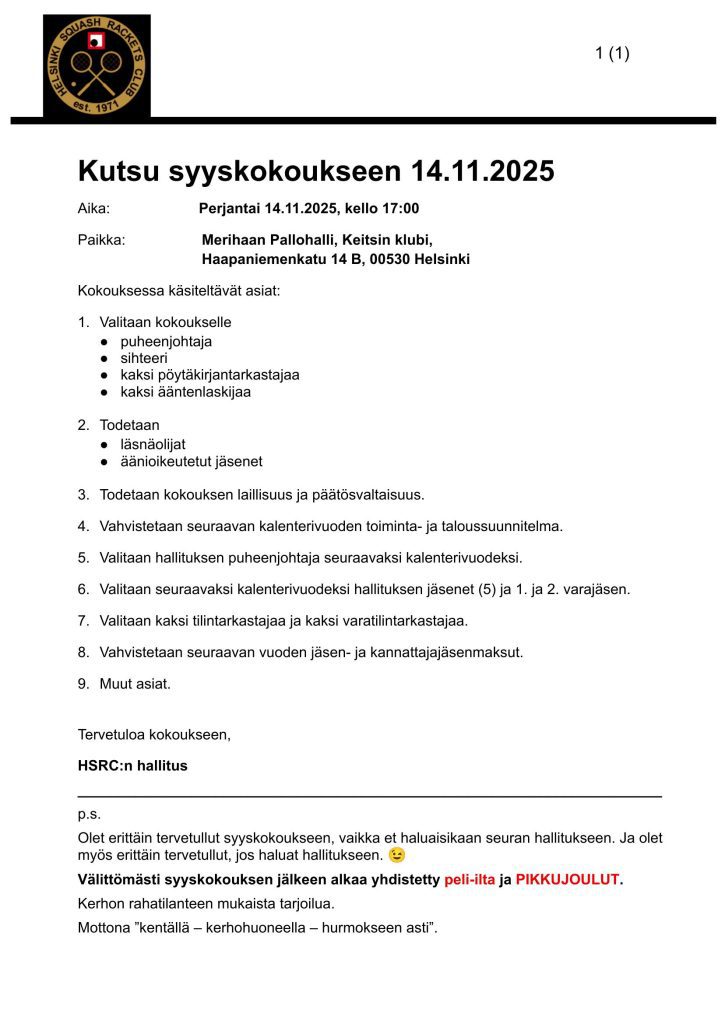 Seuran syyskokous järjestetään perjantaina 14.11.2025 klo 17:00 Keitsin Klubilla, Merihaan Pallohallilla, osoitteessa Haapaniemenkatu 14 B, 00530 Helsinki. Syyskokouksen jälkeen jatkamme iltaa pikkujoulujen merkeissä, ensin kentillä, sitten kerhohuoneella. Lämpimästi tervetuloa mukaan!