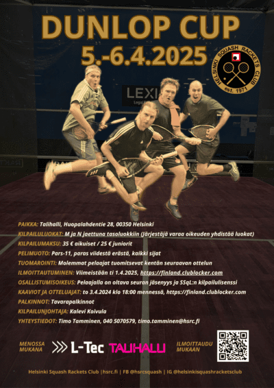 Dunlop Cup, kevään lennokkain squashkilpailu! https://www.squash.fi/Dunlop+Cup+2025 Dunlop Cupin kaaviot löydät allaolevasta osoitteesta: https://clublocker.com/tournaments/17581/draws Tuloksia voit seurata reaaliajassa osoitteessa: https://clublocker.com/static/tournament_scoreboard/#/tournament=17581&division=0 Livestriimi kentiltä 1 ja 2 on